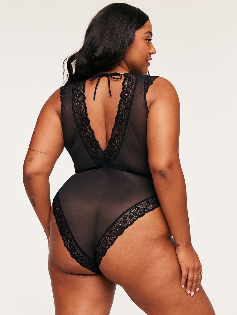 Crafted in mesh and traced in lace, this sheer bodysuit gets a little edgier with its plunging neckline and high-cut leg.