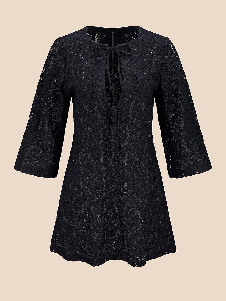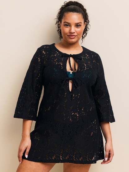 Go poolside to streetside in this cover-up, with an open-knit lace construction and front plunge neckline.
