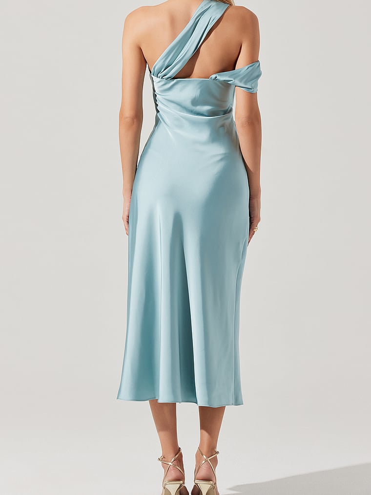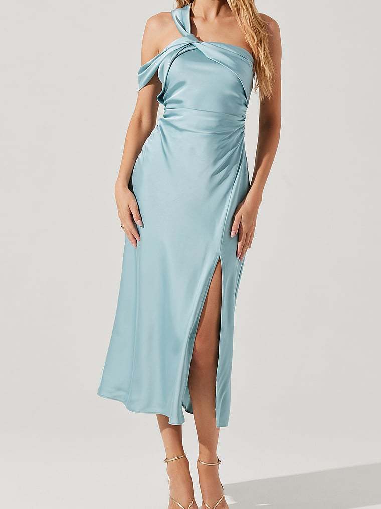 Luxurious satin elegantly drapes across your body on this glamorous silhouette that’s finished with an asymmetrical neckline, ruched details, and a dramatic side slit.