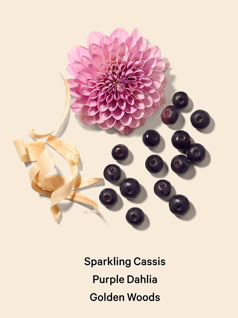 - Notes: sparkling cassis, purple dahlia, golden woods