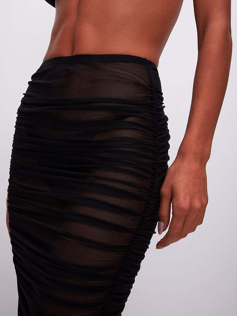 From pool to party: Ruched details add a decadent finish to this sheer style that’s perfect as a cover-up or can be paired with the matching Mesh Tank Top for a bold evening look.