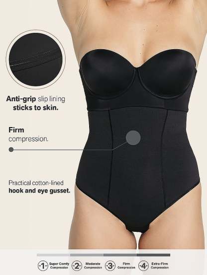 This innovative thong features our trademark PowerSlim® firm compression fabric to sculpt your torso from the waist down. It also has an outer layer of our signature DuraFit® fabric for added softness, comfort, and breathability. This thong has an anti-slip grip lining on the leg bands to keep them in place, no matter what. By Leonisa.