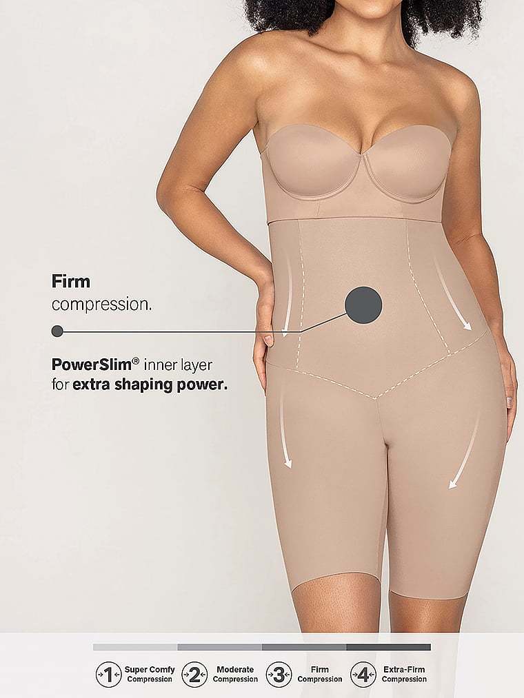 - Extra-high waistband features PowerSlim® fabric for moderate compression to sculpt your torso and refine your waist