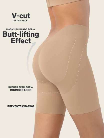 This shaper short is designed with a plunging back, making it perfect for low-cut and backless tops and dresses. It features moderate compression in the tummy and a seamless design—with no elasticated leg bands or waistband—that goes practically undetectable under clothes.
