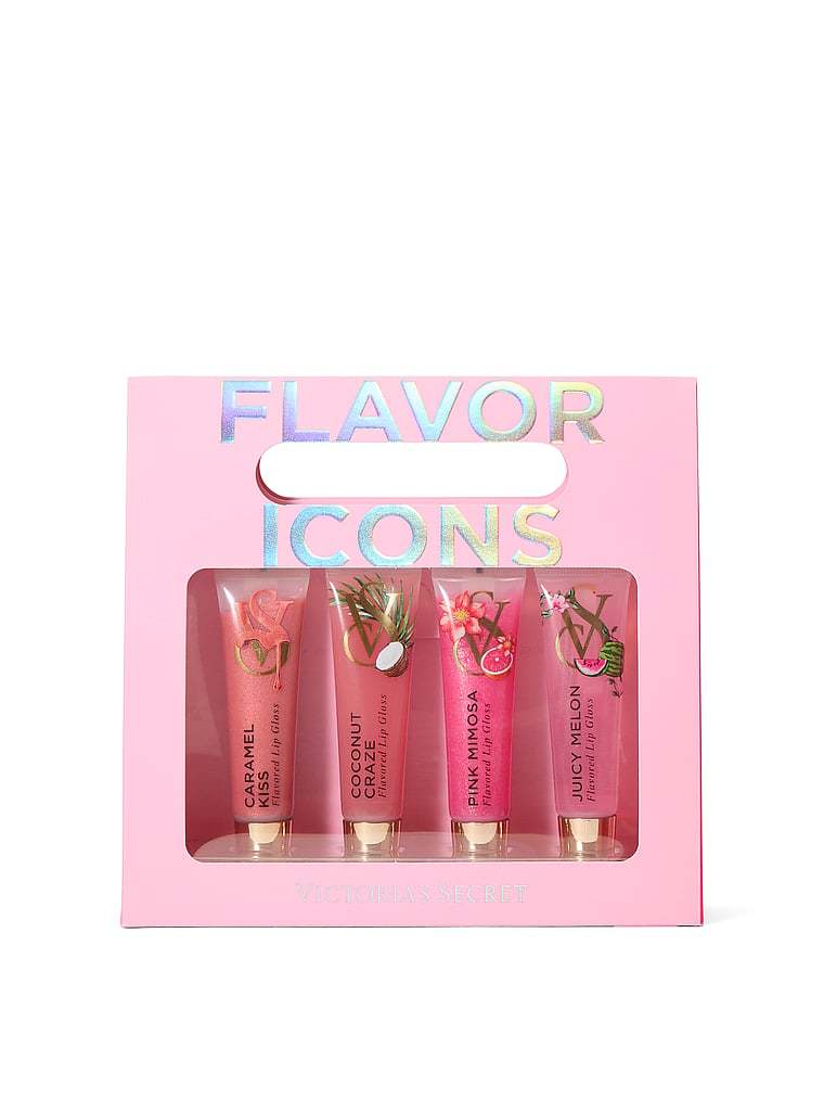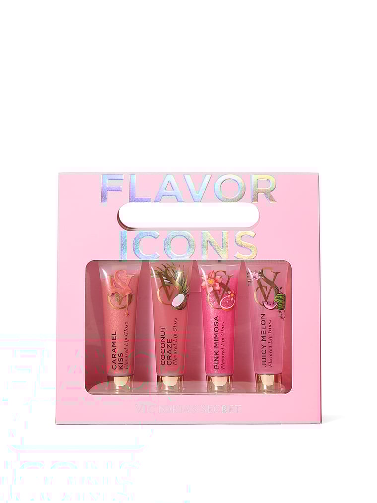 Delicious flavor, lustrous shine. Discover four of your new favorite flavored glosses for a beautifully radiant pout. This set includes Pink Mimosa, Caramel Kiss, Juicy Melon, and Coconut Craze for a luminous shade for every occasion.