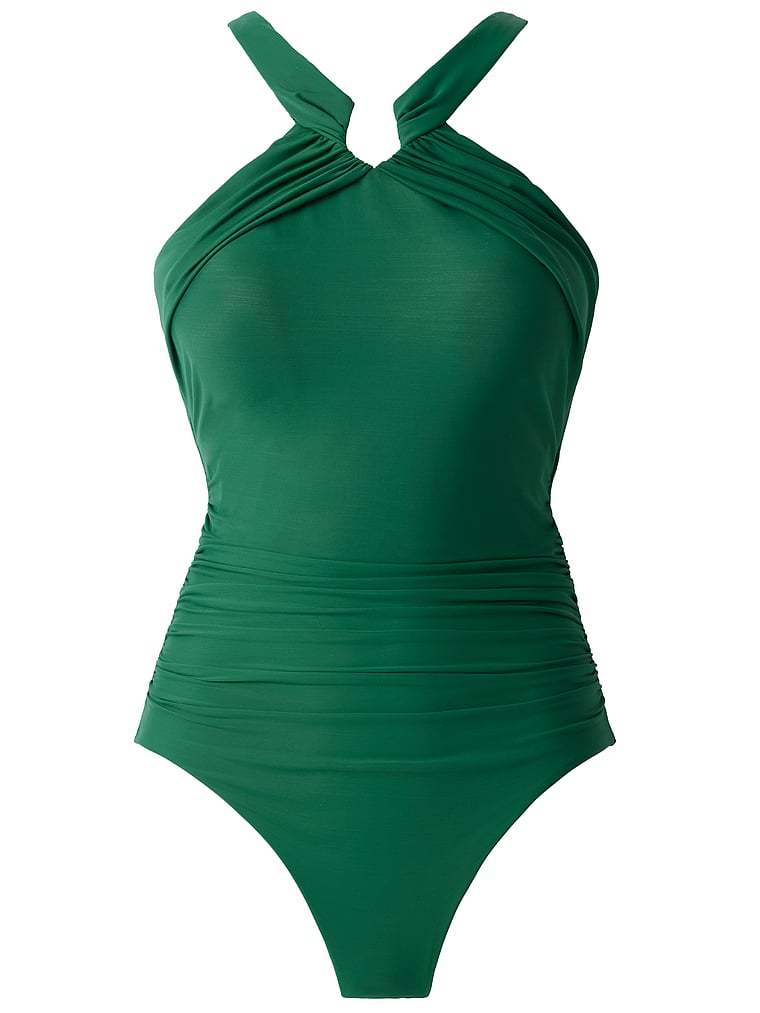 Channel your inner goddess with a striking notched neckline and precise shirring that sculpts and cinches, plus an allover slimming effect.