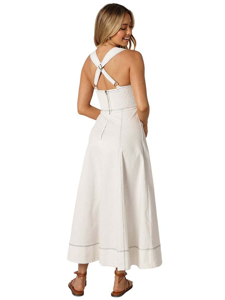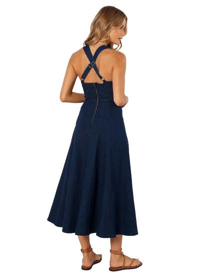 This chic midi Length is a spring closet must-have. Crafted from mid-stretch denim, adjustable cross-back straps and a sweetheart neckline add a romantic touch.