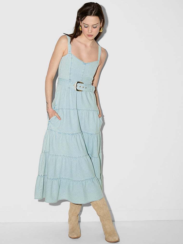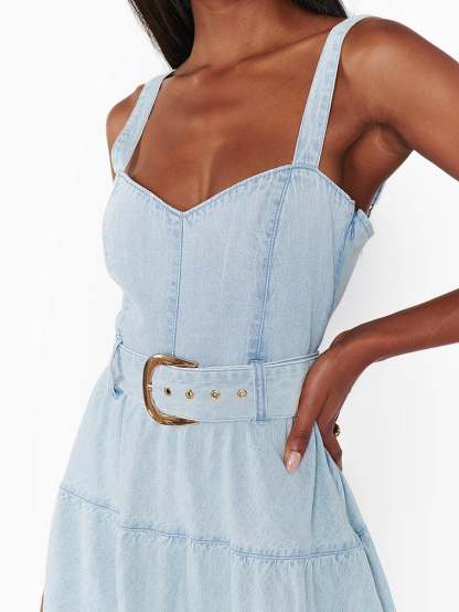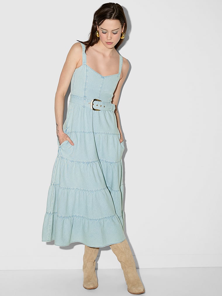 It's easy to get a flattering fit in this denim Midi Dress. It has a sweetheart neckline and an adjustable waist belt so you can ride into the sunset.